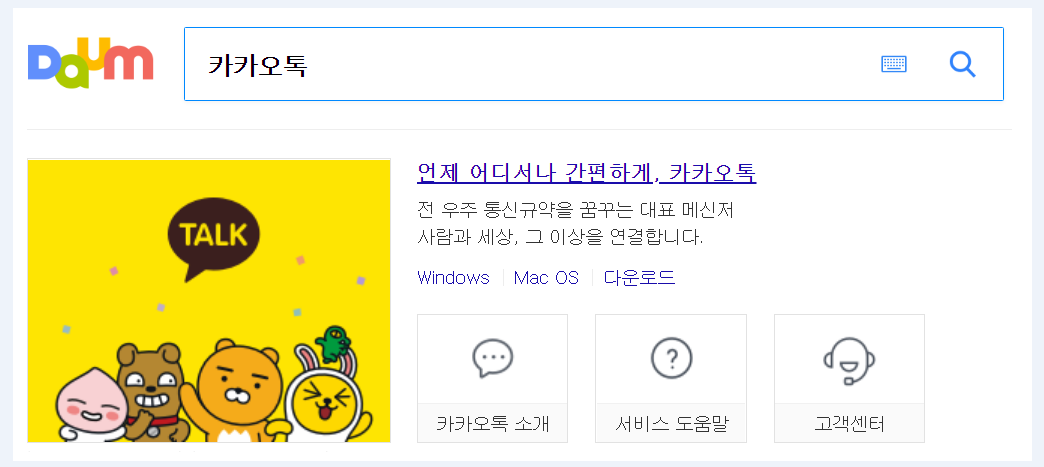 스마트폰이나 태블릿이야 스토어에서 받으면 되기 때문에 패스를 하겠습니다. 컴퓨터는 네이버, 다음, 구글, 네이트, zum 등의 사이트에서 '카카오톡'을 서치하고 공식홈페이지를 통해 받으시면 되네요.