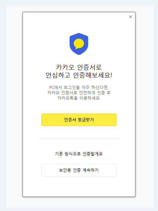 그럼 다음으로 최근에는 카카오 인증서 발급도 가능하다는 화면이 나오게 되네요. PC로그인을 자주하실 때에 보안상 인증서를 이용하면 더욱 편리하다고 하네요.