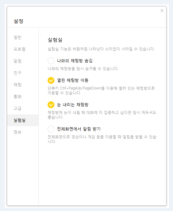 그리고 전체화면에서 영상이나 게임 등을 이용하실 때에 알림을 받는 기능이나 나와의 채팅방을 숨겨놓을 수 있는 기능들이 실험실에서 사용됩니다. 잘써먹으면 무척 편리해요.