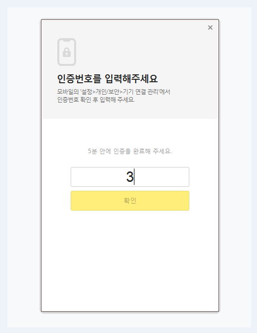 인증서는 그렇다치고 보통상의 로그인을 하실 때도 처음에는 보안 인증을 거쳐야 합니다. 이는 모바일 카카오톡을 통해서만 가능하기 때문에 우선적으로 본인 명의의 휴대전화에 카톡이 있어야 하네요. 여기에서는 내 PC나 1회용 인증으로 넘어갈 수 있습니다. 그러면 모바일 카톡으로 번호가 오게되어 이를 입력하는 방식을 활용하게 되네요.