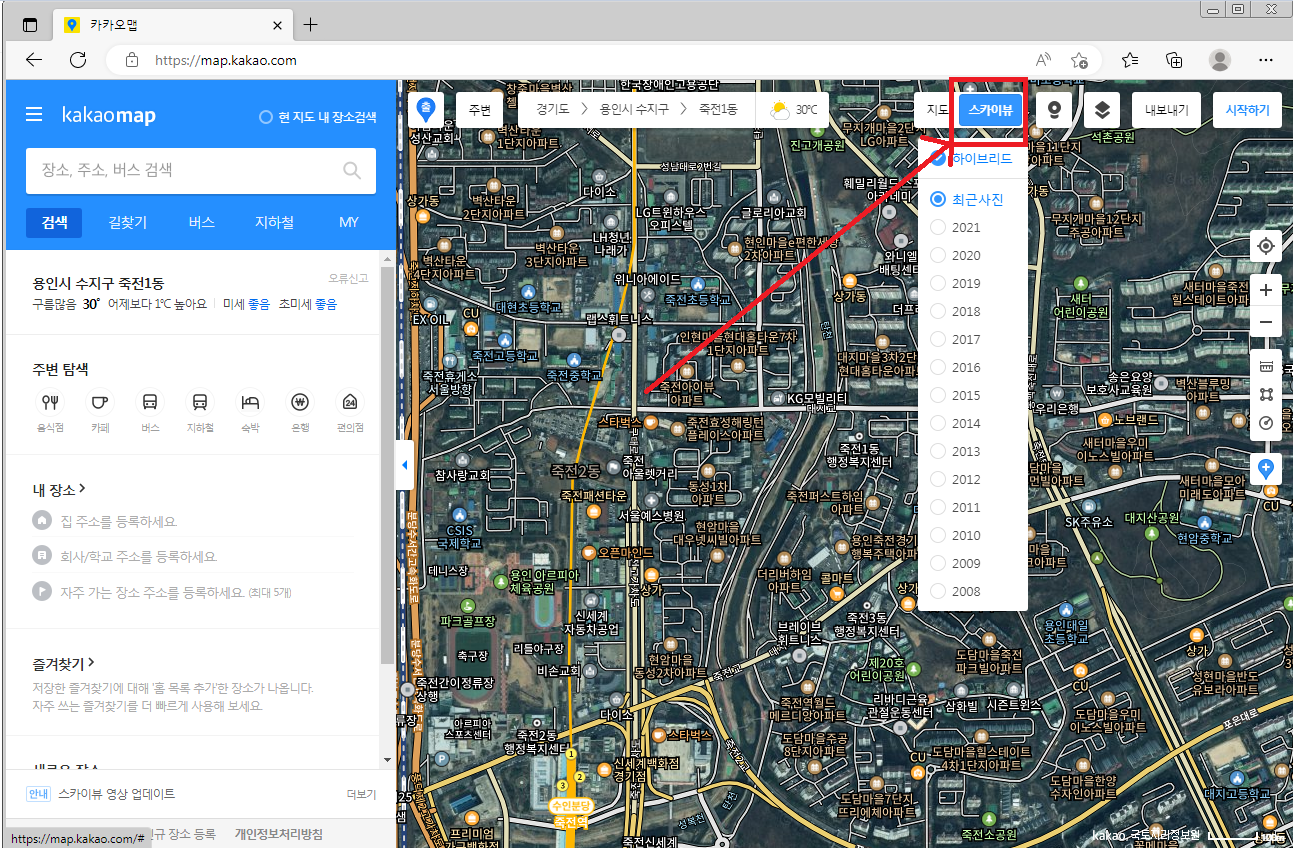 다음지도에서 항공뷰를 보는 방법은 무척이나 간단한데요. 다음지도 앱이나 웹서비스에 접속하여 '스카이뷰'를 선택하시면 바로 항공사진과 같은 뷰를 확인하실 수 있습니다.